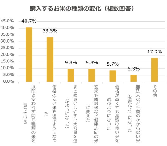 特に価格高騰幅が大かったお米の購入の変化について聞いたところ、「以前と変わらず同じ種類を購入」と答えた人が40.7%と最多であるものの、次いで「価格の安い米を選ぶ」が33.5%となっており、節約志向が強まっていることが分かりました。