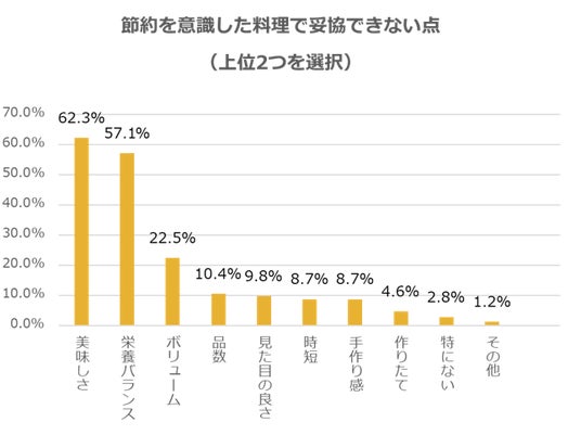 62.3%と多数が「美味しさ」、57.1%と半数以上が「栄養バランス」と回答しており、節約をしながらも食事の質は落としたくないと考えていることが分かりました。