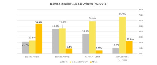 その結果、買い物金額が「増えた」が24.1pt増の54.4%と大幅に増加し、買い物の量が「減った」が13.6pt増の44.8%に増加しました。買う量が減ったにも関わらず支出が増えている状況から、2022年時に比べて、今日現在の値上げがより大きく家計に響いていることが分かります。