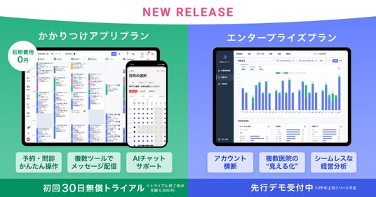 今回、こうした環境の変化に合わせ、既存の「トータル支援プラン」に加えて、まずは予約・リコールなどから歯科DXをはじめて患者とのつながりを強化したい歯科医院に向けた安価なスタータープラン「かかりつけアプリプラン」と、今後増加が見込まれるグループ法人による経営効率化へのニーズに対応する「エンタープライズプラン」の2つのプランの提供を開始します。