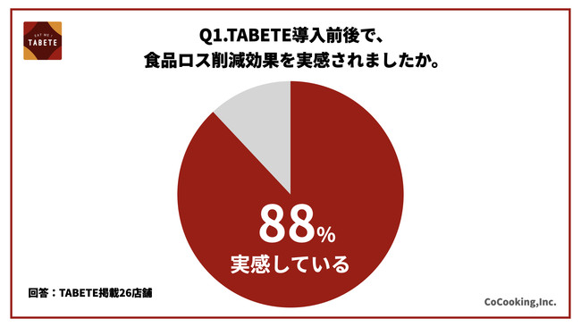 1)88%以上が「TABETE導入による食品ロス削減効果を実感」と回答。