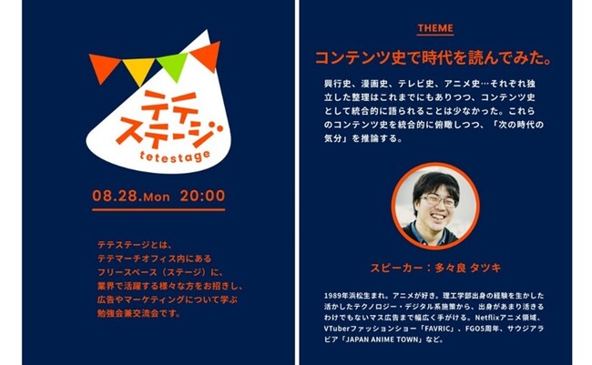 企業向けSNSマーケティング支援を中心としたビジネス展開をするテテマーチ株式会社(本社:目黒区、代表取締役:上田 大介)は、広告代理店でプランナー兼コピーライターを務める多々良タツキ氏をゲスト講師にお呼びして、9回目となる当社主催の勉強会兼交流会イベント「テテステージ」を開催しました。