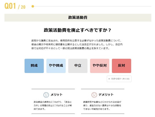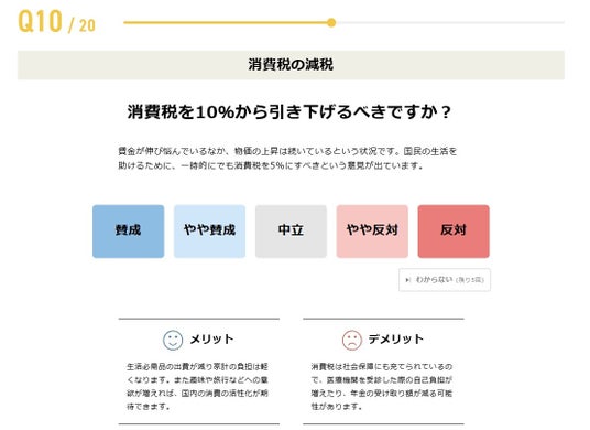今回の衆院選の「争点」として挙げられている政策活動費の廃止や消費税減税、「年収の壁」問題、高齢者医療費の自己負担など幅広い分野の設問になりますが、全ての質問に概要を説明する「解説文」と「メリット」「デメリット」を記載することで、利用者の判断材料をご提供します。