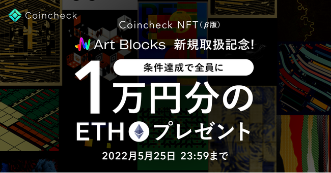 コインチェック株式会社(以下、コインチェック)が提供するNFTマーケットプレイス「Coincheck NFT(β版)」では、ジェネレーティブアートNFT「Art Blocks」の取扱い開始を記念したキャンペーンを本日より実施いたします。本キャンペーンでは、期間内にArt BlocksのNFTをCoincheck NFT(β版)に出品し、合計10万円以上で購入された方全員にもれなく1万円相当分のETHをプレゼントいたします。