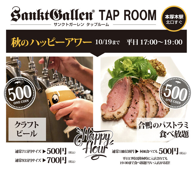 サンクトガーレン有限会社(神奈川県厚木市/代表取締役 岩本伸久)は、本厚木駅北口すぐの直営タップルームにて2022年9月16日(金)~10月19日(水)まで「秋のハッピーアワー」を実施致します。