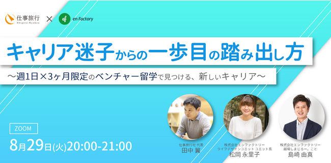 株式会社エンファクトリー(東京都千代田区、代表取締役社長CEO加藤健太、以下、弊社)と株式会社仕事旅行社(東京都港区、代表:田中 翼、以下「仕事旅行社」)は、2023年8月29日20:00-21:00より、「キャリア迷子からの一歩目の踏み出し方~週1日×3ヶ月限定のベンチャー留学で見つける、新しいキャリア~」を開催します。 (URL:https://20230829.peatix.com/)