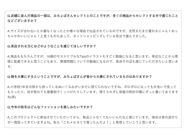 トークセッションの最後に、みちょぱさんは「先月アンバサダーに任命していただいてから、メルカリで5万点も出品されたと聞いて、沢山の方が参加し、多くの関心を頂いたプロジェクトであると実感しました。買い物するだけでもサステナブルなアクションになるということで、気軽にできることを皆様に知っていただきたいです。」とコメント。大山さんは「みちょぱさんの衣装もまさか網を使ったファッションであると思いもよらず、そういう工夫で次の方にバトンタッチできることは素晴らしい。」と感心。Takumaさんは「僕自身このプロジェクトを通してサステナブルに関心を持ったので、皆様にも思っていただけるように発信していきたい。」と循環型社会に向けてメッセージを投げかけた。
