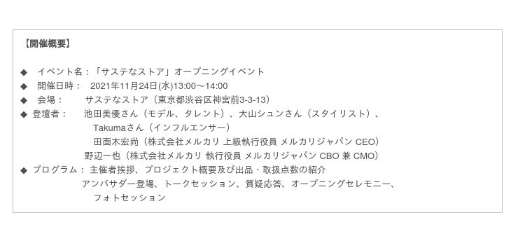 株式会社メルカリ(以下、メルカリ)は、欧州を中心に広がっている持続可能な消費を促す「グリーンフライデー」にあわせ、新たなSDGsの活動の一環として2021年11月25日~11月27日の期間限定で、サステナビリティが学べて体験できる、メルカリ初のお客さま参加型ファッション実店舗「サステなストア」を表参道にオープンする。そのオープンに伴い、前日の24日、同店にて「サステなストア」オープニングセレモニーを開催した。