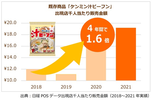 〇おうちごはん需要の増加をきっかけに、あっさり食べられる汁ビーフンの人気も高まっており、既存商品「ケンミン汁ビーフン」の販売が、4年間で1.6倍に伸長しています。