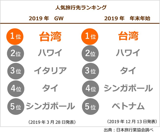 ◆「台湾」はコロナ前の人気旅行先ランキング5年連続1位