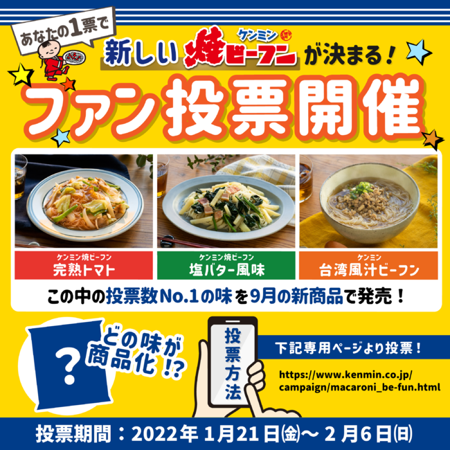 新商品候補3品の中からケンミンビーフンシリーズ2022年秋の新商品1品を決定するファン投票を実施。