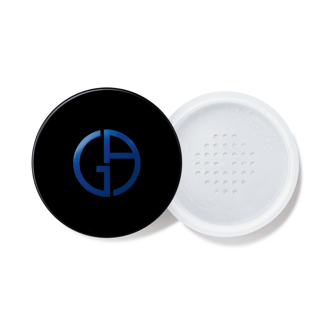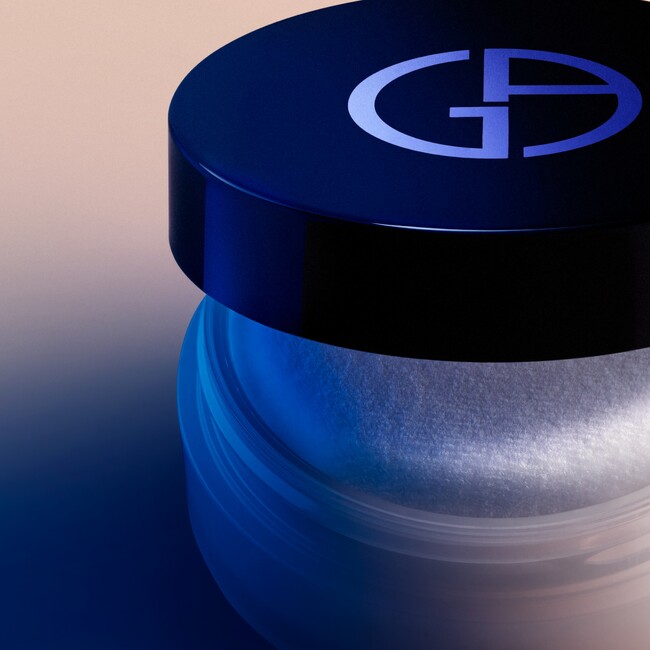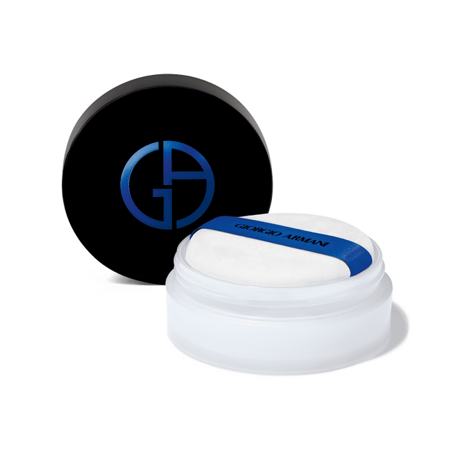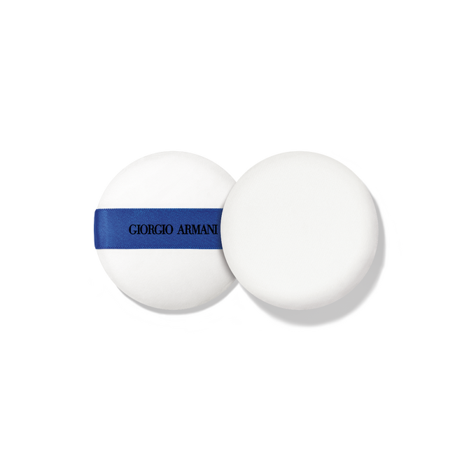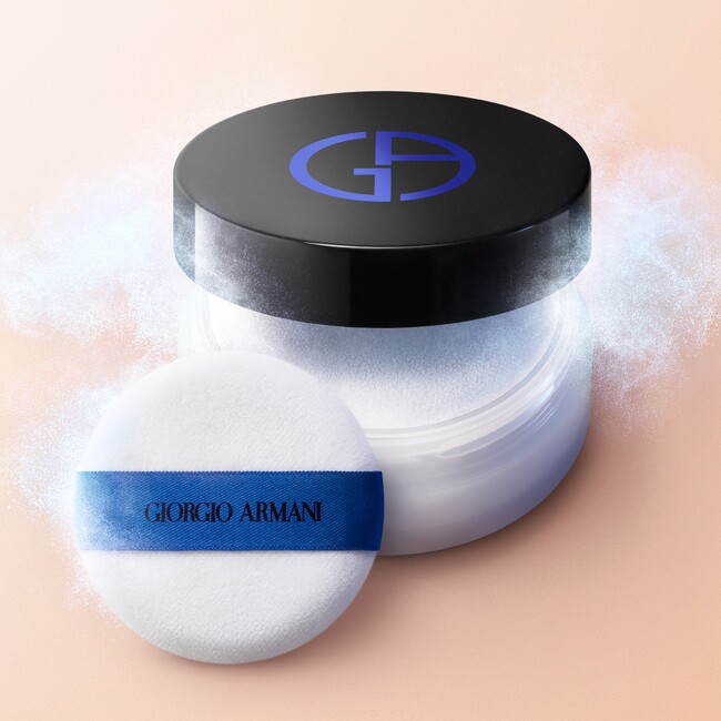 「デザイナー ルース パウダー」のケースはブラックの蓋に、ジョルジオ アルマーニのロゴが「デザイナー」シリーズのカラーコードである鮮やかなブルーでエンボス加工されています。また、中身が見える半透明のフロストパッケージが、ブラックの蓋とのコントラストを生み出しています。弾力のあるクッションパフには、ジョルジオ アルマーニのロゴが刻まれた青いリボンが縫い付けられています。