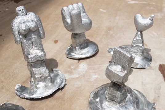 どろどろの金属で好きな形をつくろう!発泡スチロールを彫刻し、その原型を使って専門工房にてアルミ鋳造を行います。