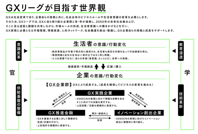 GX(グリーントランスフォーメーション)に積極的に取り組む「企業群」が、官・学・金で GX に向けた挑戦を行うプレイヤーとともに、一体として経済社会システム全体の変革のための議論と新たな市場の創造のための実践を行う場です。
