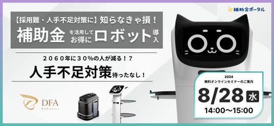 労働人口の減少、2030年台半ばまでに最低賃金1500円を目指す国の方向など、業種問わず企業経営において、近い将来労働力の確保が難しくなる事は明白です。 本セミナーでは、上記の課題を打破する為のロボットと補助金を活用した、人手不足対策の解決方法を一挙公開致します。 株式会社補助金ポータル(本社:東京都渋谷区、代表取締役:福井彰次)は株式会社DFA Robotics(本社:東京都渋谷区、代表取締役社長 松林 大悟)と共同で「【採用難・人手不足対策に】知らなきゃ損!補助金を活用してお得にロボット導入」をテーマにした無料オンラインセミナーを2024年8月28日(水)14時より開催いたします。Zoomでどなたでもお気軽にご視聴いただけますので、ぜひご参加ください。