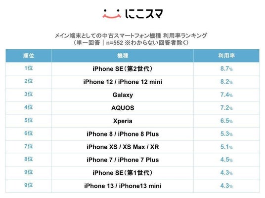 中古スマートフォンをメイン端末として利用する10代~60代以上の男女552名に、利用しているスマートフォンの機種を質問したところ、1位「iPhone SE(第2世代)」(8.7%)、2位「iPhone 12 / iPhone 12 mini」(8.2%)、3位「Galaxy」(7.4%)となりました。