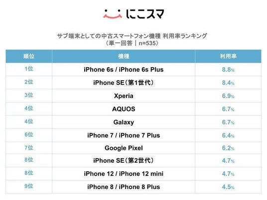 サブ端末を中古で購入した10代~60代以上の男女535名に、利用している機種を質問したところ、1位「iPhone 6s / iPhone 6s Plus」(8.8%)、2位「iPhone SE(第1世代)」(8.4%)、3位「Xperia」(6.9%)となりました。