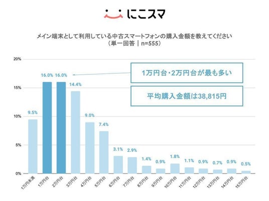 中古スマートフォンをメイン端末として利用する10代~60代以上の男女555名に、利用しているスマートフォンの購入金額を質問したところ、「1万円台」(16.0%)、「2万円台」(16.0%)が最も多く、次いで「3万円台」(14.4%)となり、平均購入金額は38,815円となりました。