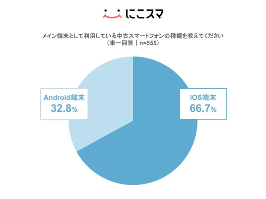 中古スマートフォンをメイン端末として利用する10代~60代以上の男女555名に、端末の種類を質問したところ、66.7%がiOS端末、32.8%がAndroid端末を利用していると回答しました。