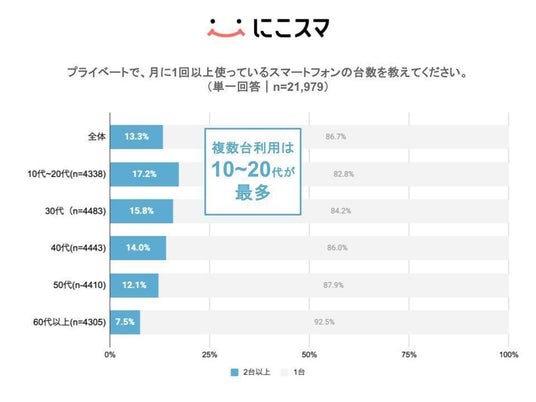 10代~60代以上の男女21,979名に、月に1回以上使っているスマートフォンの台数を質問したところ、「2台以上」と回答したのは、10代・20代(17.2%)が最も多く、次いで30代(15.8%)、40代(14.0%)となりました。また、複数台利用率が最も少なかったのは60代(7.5%)で、10代・20代と比較すると9.7ポイントの差がでる結果となりました。