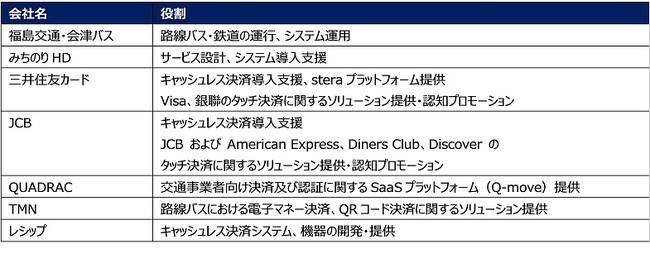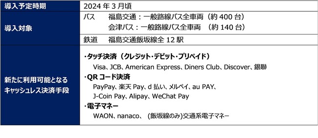 福島交通株式会社(代表取締役社長:武藤 泰典、以下:福島交通)、会津乗合自動車株式会社(代表取締役社長:佐藤 俊材、以下:会津バス)、株式会社みちのりホールディングス(代表取締役グループCEO:松本 順、以下:みちのりHD)、三井住友カード株式会社(代表取締役社長:大西 幸彦、以下:三井住友カード)、株式会社ジェーシービー (代表取締役兼執行役員社長:二重 孝好、以下:JCB)、QUADRAC 株式会社(代表取締役社長:高田 昌幸、以下:QUADRAC)、株式会社トランザクション・メディア・ネットワークス(代表取締役:大高 敦、以下:TMN)、レシップ株式会社(代表取締役社長:杉本 眞、以下:レシップ)は、2024年3月に福島交通・会津バスの運行する路線バス全車両(約540台)と、福島交通飯坂線の全駅に各種キャッシュレス決済を導入いたします。