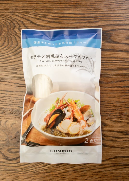 「食文化の継承と革新」をコンセプトに国産の素材を用いた新商品、「ホタテと利尻昆布スープのフォー」。この商品は、新潟県上越市産の特選うるち米「亜細亜のかおり」と北海道の自然が育んだ馬鈴薯から作られる国産米麺、北海道函館産の真昆布とかごめ昆布を使用した深い味わいのスープが特徴です。■利尻昆布とホタテで織り成すスープ