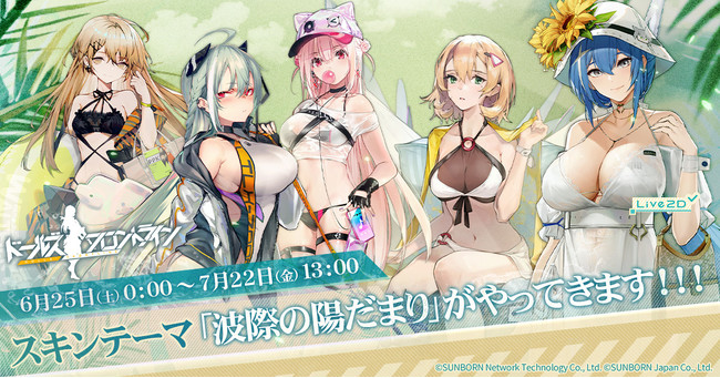 今年も夏を楽しむ為にとっておきの水着を用意したキャラクター達の新スキンテーマ「波際の陽だまり」が「6月25日(土)0:00」よりゲーム内に追加されます。