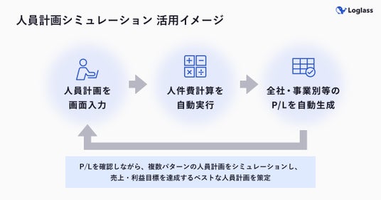 これらの課題を解消するために、今回の新機能では、表計算ソフトを介すことなく、「Loglass 人員計画」の画面上に人員数を入力するだけで、人件費計算を実行し、P/L(損益計算書)を自動生成できるようにしました。これにより、複数パターンの人員計画をシミュレーションしながら、売上・利益目標を達成するベストな人員計画を、誰でも簡単かつスピーディーに策定できるようになります。