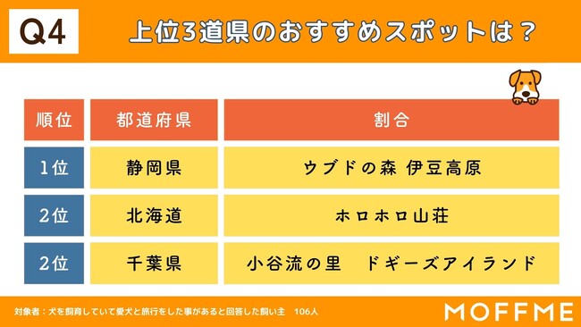 静岡県では「ウブドの森」、北海道では「ホロホロ山荘」、千葉県では「ドギーズアイランド」が愛犬家に人気なスポットとして複数の回答がありました。
