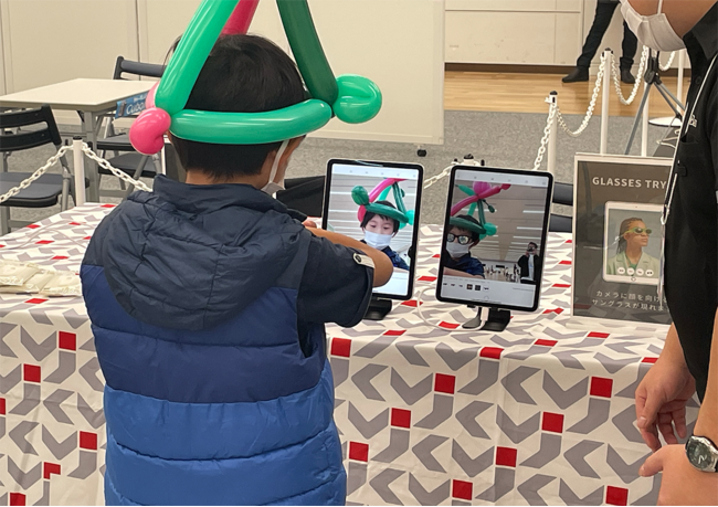 こども向けワークショップの博覧会イベント「ワークショップコレクション」にて、来場者にバーチャルトライオンを体験いただきました。カメラの前に立つだけで様々なアイテムが瞬時にバーチャル試着ができ、JCVが提供する画像認識、ARをベースにした着せ替え体験をお楽しみ頂きました。