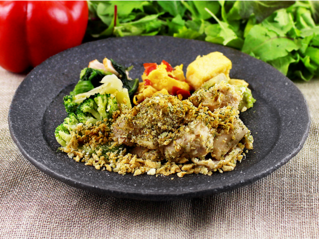 さっぱりとレモンをきかせたチキンのガーリックオイル焼きをご用意いたしました。しっとりと焼き上げた鶏もも肉に青のり、大豆ミートとチーズをトッピングしております。鶏肉の旨味を吸ったブロッコリーと共にお召し上がり下さい。