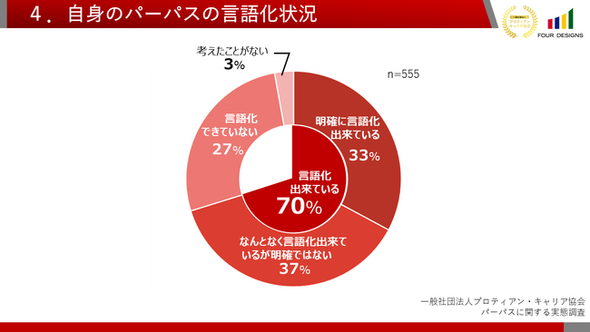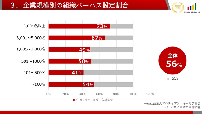 組織と個人のより良き関係性構築と個人の主体的なキャリア開発を支援する一般社団法人プロティアン・キャリア協会 (東京都新宿区、代表理事:田中研之輔・有山徹、以下、「当協会」)は、8月26日(土)に開催するプロティアンフォーラム2023~未来を創るパーパスの可能性~(申込:https://protean-career.or.jp/forum2023)開催にあたり、人事部門・キャリア支援者・経営陣他555人を対象にパーパスに関しての実態調査を実施いたしました。