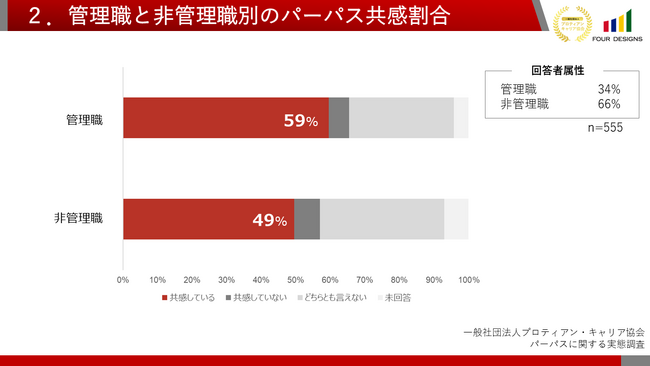 企業のパーパスへの共感は管理職、非管理職の区分で見ると管理職が59.6%、非管理職が49.6%と10ポイント管理職が上回る。