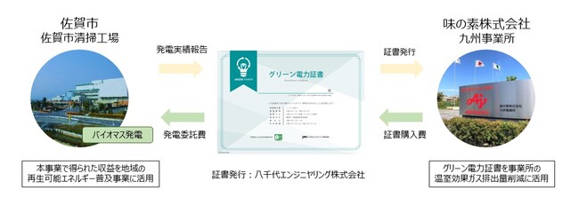 味の素株式会社(社長:藤江 太郎 本社:東京都中央区)は、九州事業所(佐賀県佐賀市諸富町)で、佐賀市(市長:坂井 英隆)清掃工場におけるバイオマス由来の発電量分を「グリーン電力証書」として2023年4月発電実績分より順次、購入することを決定しました。この「グリーン電力証書」は、証書発行事業者である八千代エンジニヤリング株式会社(社長:高橋 努 本店:東京都台東区)から購入します。