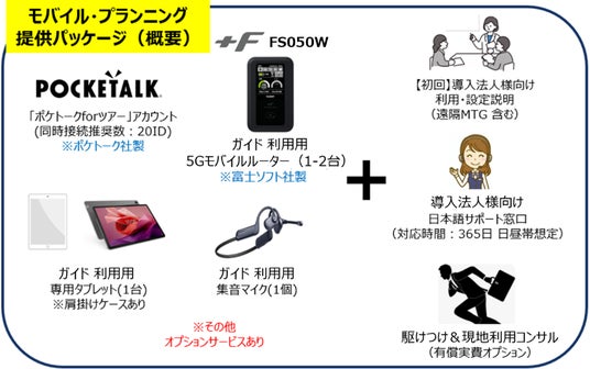 富士ソフト株式会社は、こうした市場課題に対応するため、株式会社モバイル・プランニングとポケトーク株式会社との3社協業を開始しました。ポケトーク株式会社のAI同時通訳「ポケトーク for ツアー」をお客様に迅速かつ柔軟にご利用いただけるよう、レンタル&サブスクプラン※2を展開してまいります。そのために必要となる基本サービスアカウント、およびガイド・ツアー参加者が利用可能な富士ソフト製5Gモバイルルーター「+F FS050W」、ガイド用タブレット、集音マイク、導入後の各種サポートを株式会社モバイル・プランニングとともにパッケージ化し、提供を開始いたします。