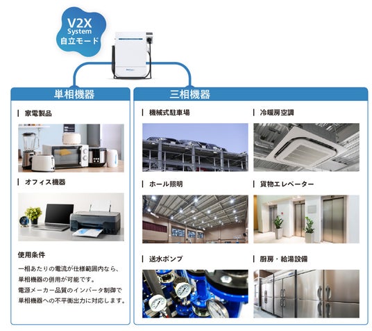 (※2026年3月31日時点、電気自動車用充放電器の自立出力として同期通信線や上位/下位機能等の仕組を用いずに自立出力配線を単純並列結線することにより実現できる電力合算機能として。当社調べ。)