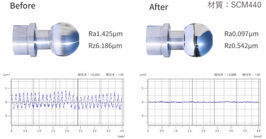 ボールスタッドやタイロッドエンドといった自動車の駆動部品は、球面形状が不可欠であり、加えて高精度かつ高品質な表面仕上げが求められるため、加工難易度が非常に高い領域です。これまで球面形状の高品質加工には、熟練の技能を必要とする専用機に依存することが多く、導入コストや運用負担が大きな課題でした。