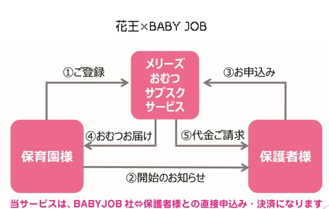 花王では、2019年から紙おむつ「メリーズ さらさらエアスルー」「メリーズパンツ さらさらエアスルー」のサブスクリプションを実施していましたが、昨今の需要拡大を受け、今回BABY JOB株式会社と協働することにより、新たな決済システムを構築。保護者からの利用料受け取りはBABY JOB株式会社が担うため、保育園は決済にかかわる負担がなく、導入しやすくなりました。