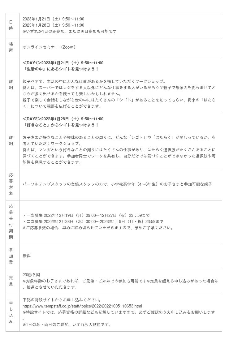 総合人材サービスのパーソルグループで人材派遣・アウトソーシング事業を手掛けるパーソルテンプスタッフ株式会社(本社: 東京都渋谷区、代表取締役社長: 木村 和成、以下パーソルテンプスタッフ)は、子どもたちのキャリア教育の機会を提供する、パーソルテンプスタッフ未来のはたらくを考えるワークショップ “親子で探そう「シゴト・はたらく」”を登録スタッフ親子向けに2022年11月19日(土)、11月26日(土)にオンライン開催しました。