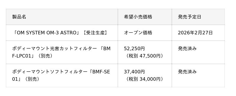 OMデジタルソリューションズ株式会社(代表取締役社長 兼CEO:杉本 繁実)が展開する映像製品ブランド「OM SYSTEM」は、天体撮影に最適な光学特性を備えた「マイクロフォーサーズシステム規格」準拠のミラーレス一眼カメラ「OM SYSTEM OM-3 ASTRO」を2026年2月27日から発売いたします。