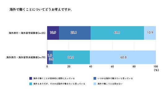 海外で働くことについて、海外旅行・留学未経験者の60%以上が「海外で働こうと思わない」と回答した一方、経験者はわずか11%という回答に。さらに、経験者の40%は「海外で働くことが具体的に視野に入っている」「いつかは海外で働きたいと思っている」と回答し、海外志向の高さが伺えます。