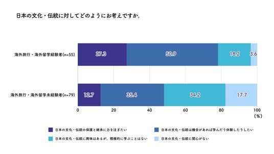 日本の文化・伝統について、海外旅行・海外留学経験者は「保護と継承に力を注ぎたい」が27%(未経験者13%)、「機会があれば学んだり体験したりしたい」は51%(未経験者35%)と、いずれも経験者が未経験者を上回りました。