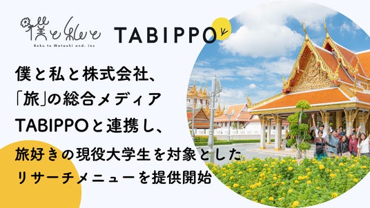 Z世代向けの企画・マーケティングを行う『僕と私と株式会社』は、「旅」の総合メディアTABIPPO(タビッポ)との提携により、日本最大の旅好き学生コミュニティ『TABIPPO学生支部』に対する調査が可能となりました。これに伴い、2024年12月より旅が好きな現役大学生を対象とした調査メニューの提供を開始することをお知らせいたします。