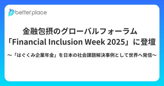 「福祉はぐくみ企業年金基金」(以下、「はぐくみ企業年金」)を中心に、企業年金・退職金制度の導入・設計をサポートする株式会社ベター・プレイス(本社:東京都新宿区、代表取締役社長:森本 新士、https://bpcom.jp/、以下、ベター・プレイス)は、2025年10月6日(月)~9日(木)に開催されるグローバルイベント「Financial Inclusion Week 2025」に代表の森本が登壇することをお知らせします。