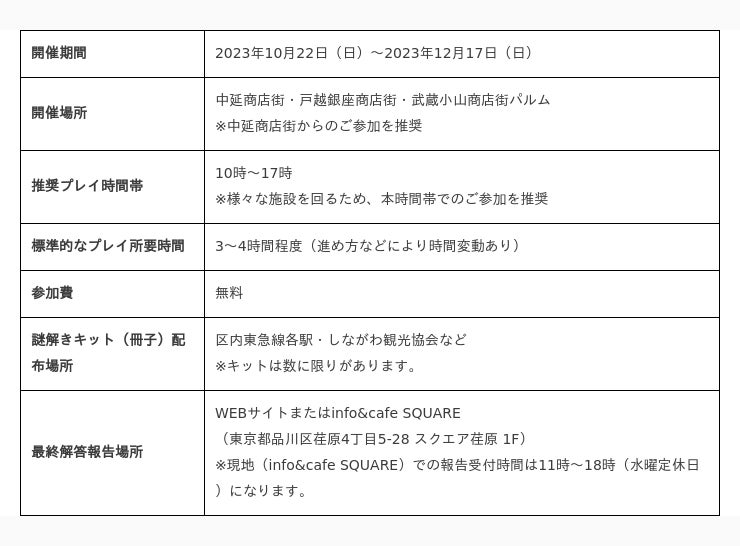 参加者は区内東急線各駅またはしながわ観光協会などで配布する謎解きキット(冊子)を携えて各商店街の謎を解いて巡り、最後の謎を解くと見つけることができるキーワードを報告。さらにアンケートに回答すると屋形船の乗船券・しながわみやげの詰め合わせなどの賞品が当たる抽選に参加できます。