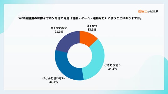 ウェブ会議用の有線イヤホンを他の用途に使うことがあるか聞いたところ、「ときどき使う」(34.3%)が最も多く、次いで「ほとんど使わない」(31.3%)、「全く使わない」(21.3%)、「よく使う」(13.1%)という結果となりました。専用利用派(「ほとんど使わない」+「全く使わない」)が52.6%と過半数を占めており、特定用途専用の道具として捉える傾向が強いことがわかります。