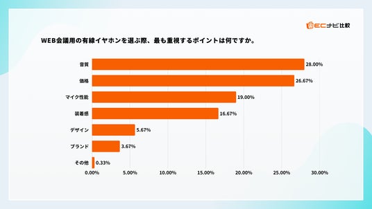 ウェブ会議用の有線イヤホンを選ぶ際に最も重視するポイントについて聞いたところ、「価格」(28.0%)が最も重視されており、僅差で「音質」(26.7%)が続いています。次いで「マイク性能」(19.0%)、「装着感」(16.7%)となっており、「デザイン」(5.7%)や「ブランド」(3.7%)は相対的に優先度が低いことがわかります。価格と基本性能のバランスを重視する実用的な判断基準がうかがえます。