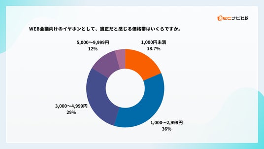 ウェブ会議向けのイヤホンとして適正だと感じる価格帯について聞いたところ、「1,000~2,999円」(36.0%)が最も多く、次いで「3,000~4,999円」(29.0%)、「1,000円未満」(18.7%)という結果となりました。5,000円未満の価格帯で全体の83.67%を占めており、業務用ツールとしての適正な投資範囲と判断されています。「5,000~9,999円」(12.0%)や「10,000円以上」(4.3%)という回答も一定数あり、用途や品質へのこだわりに応じて適正価格の認識に幅があることがわかります。