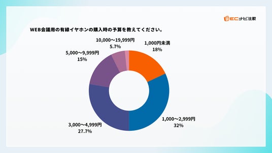 ウェブ会議用の有線イヤホンの購入時の予算について聞いたところ、「1,000~2,999円」(32.0%)が最も多く、次いで「3,000~4,999円」(27.7%)、「1,000円未満」(18.0%)という結果となりました。適正価格帯の回答とほぼ一致しており、消費者の価格感覚と実際の購買行動に一貫性があることがわかります。