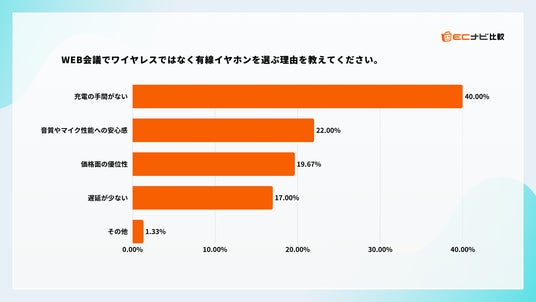 ・ウェブ会議用に有線イヤホンを選ぶ主な理由は、「充電の手間がない」(40.0%)が最多